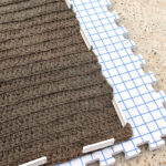 Using the lines on your blocking mats pull to stretch the rug so that it matches a rectangular shape. Push blocking comes into the outer stitches so that the rug will hold its shape. Allow to fully dry. Speed up the drying process by allowing to dry outside, however, the sun might lighten the jute on the one side facing up.