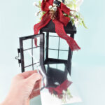 Christmas-lantern-wreath-dreamalittlebigger-01 Cut a piece of mirror paper 3.75″ x 6.5″. Apply a few pieces of double-sided tape to the back and affix it inside the back of the lantern.
