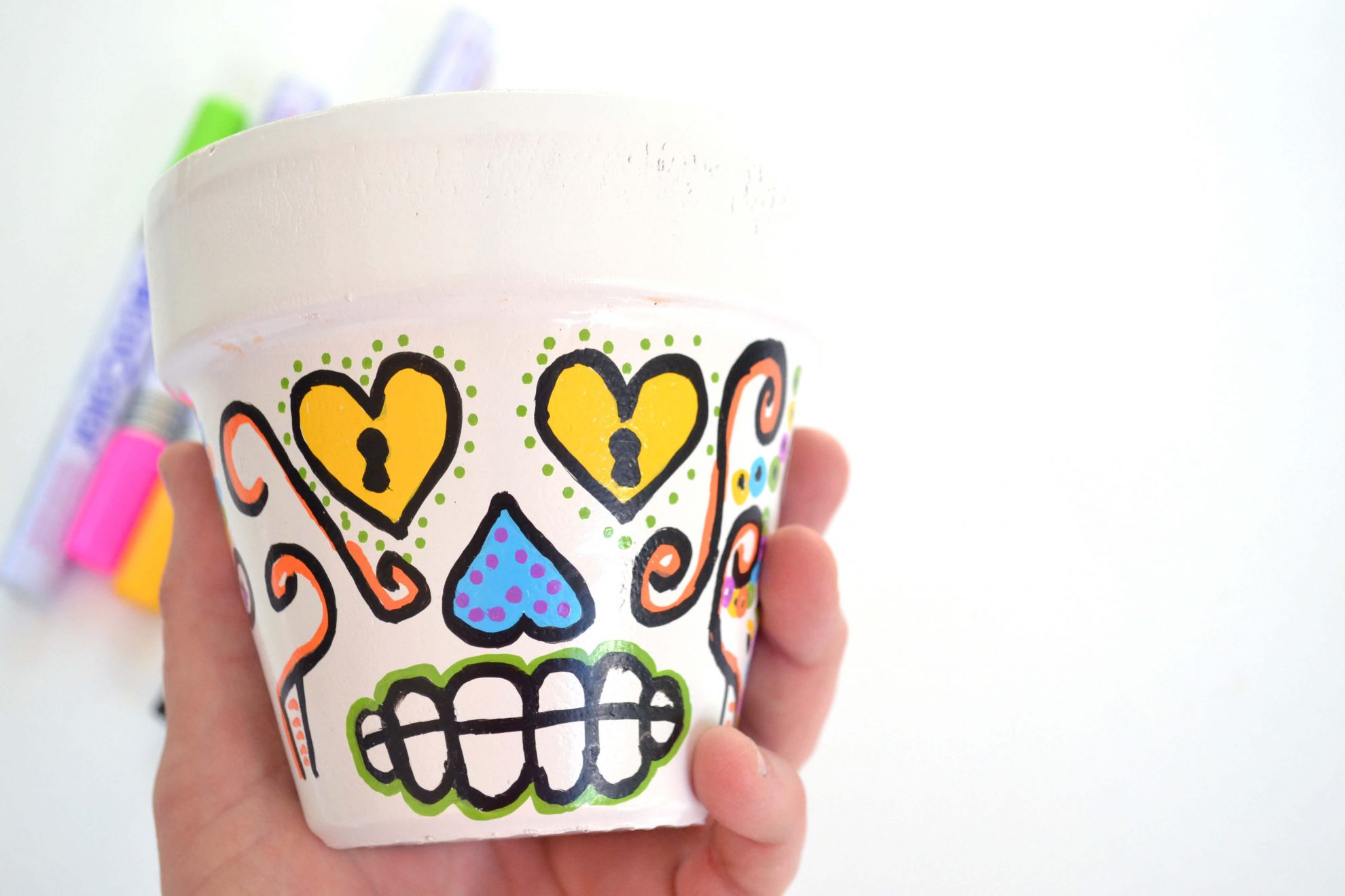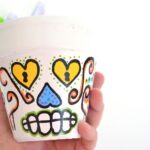 Succulents look super cute in these DIY sugar skull flower pots. Great for Halloween but colorful decor perfect for all year ’round!