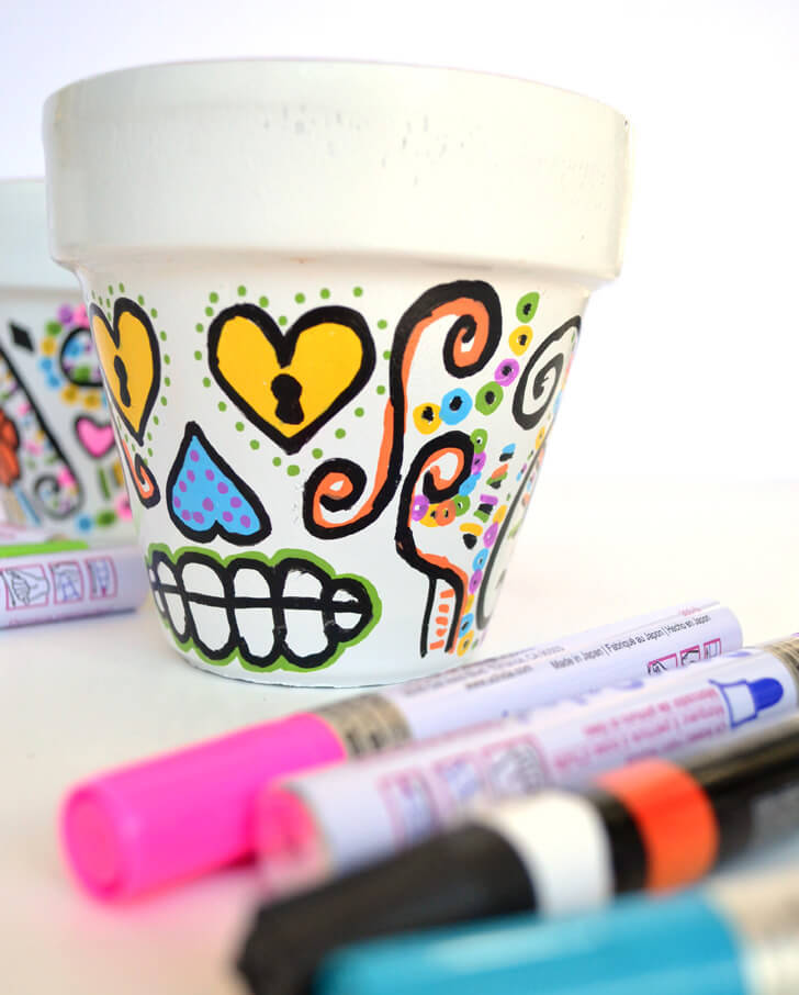 Succulents look super cute in these DIY sugar skull flower pots. Great for Halloween but colorful decor perfect for all year ’round!