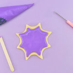 Using your background color of icing pipe following the shape of the cookie making sure it doesn’t spill over the sides. Use a toothpick, popsicle stick, or scribe tool to smooth. If the icing is still slightly uneven, gently tap it on your worktop to help level it out.