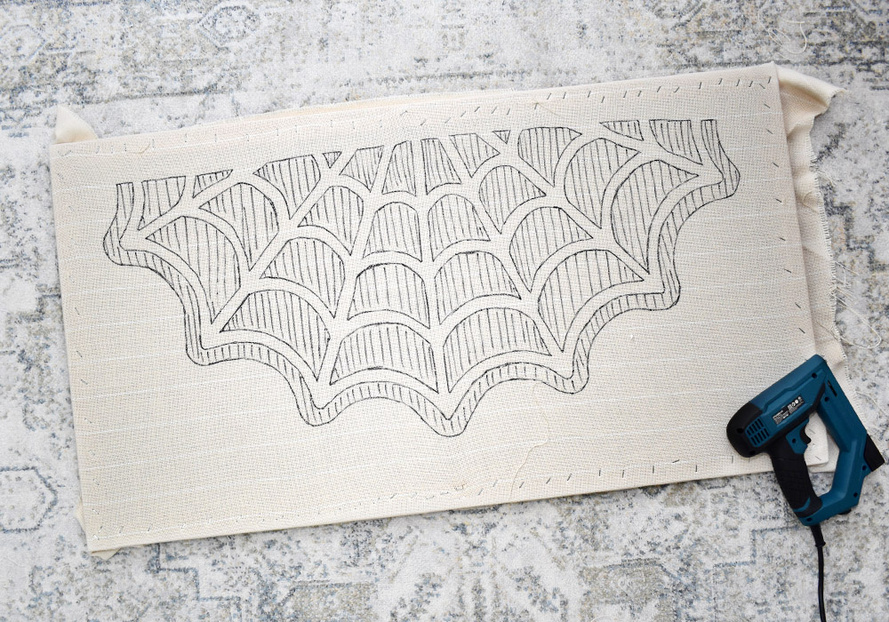 Place your monk’s cloth with the design transferred to it onto your frame, centering as well as you can. Tack the cloth around every inch or two using your staple gun, stretching the cloth just enough to keep it nice and taut on the frame. Wrap the cloth around to the back of the frame and tack down again.