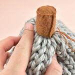 loom-knit-pumpkins-dreamalittlebigger-26 Re-thread your embroidery needle with the tail from your stem. Use it to stitch through the yarn into the stem and out of the other side to secure the stem to the pumpkin.